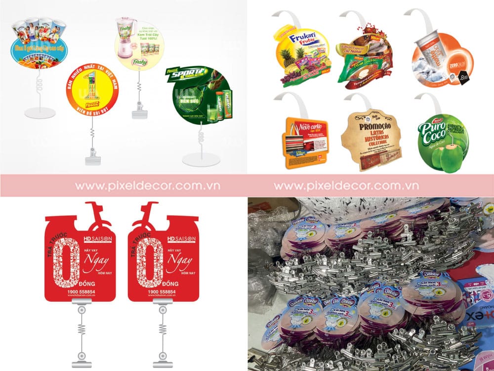 Hanger, Hanging và Dangler là những vật dụng quảng cáo treo, thường được sử dụng để giới thiệu sản phẩm hoặc các chương trình khuyến mãi. Được làm từ các chất liệu như giấy, nhựa, fomex hoặc kim loại, các sản phẩm này có thiết kế bắt mắt và dễ dàng thu hút sự chú ý của khách hàng. Hanger, Hanging và Dangler rất dễ lắp đặt, có chi phí thấp và có thể tái sử dụng nhiều lần, thích hợp cho các siêu thị, cửa hàng tiện lợi và các địa điểm bán lẻ.
